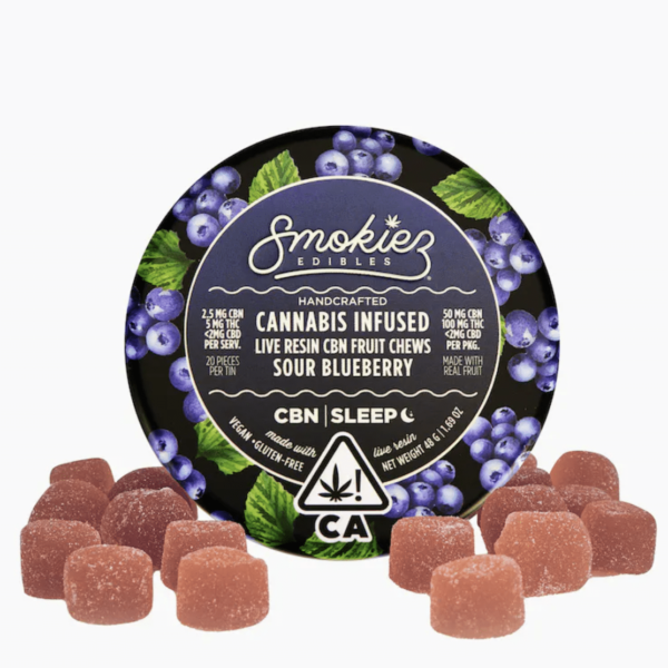 Smokiez Edibles Sour Blueberry 50mg CBN : 100mg Live Resin THC 1:1 Fruit Chews – CA