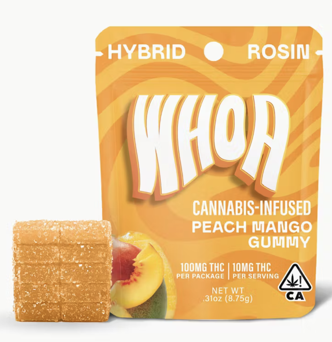 Dive into the irresistible fusion of ripe, juicy peach and lush, tropical mango in our WHOA Peach Mango Rosin Bite Gummies—a vibrant, sun-kissed flavor explosion that’s sweet, slightly tangy, and bursting with summertime freshness for an authentically delicious escape with every bite. Infused with premium solventless rosin, these full-spectrum bites deliver hybrid strain-specific effects that blend uplifting euphoria and mental clarity with soothing body relaxation, highlighting natural terpenes for a smoother, more balanced high that builds gradually and lingers without overwhelming intensity. Each compact 8.75g serving packs a potent 100mg total with convenient top perforations for easy tear-to-dose control, making it simple to savor this elevated, mouthwatering treat at your perfect pace.
